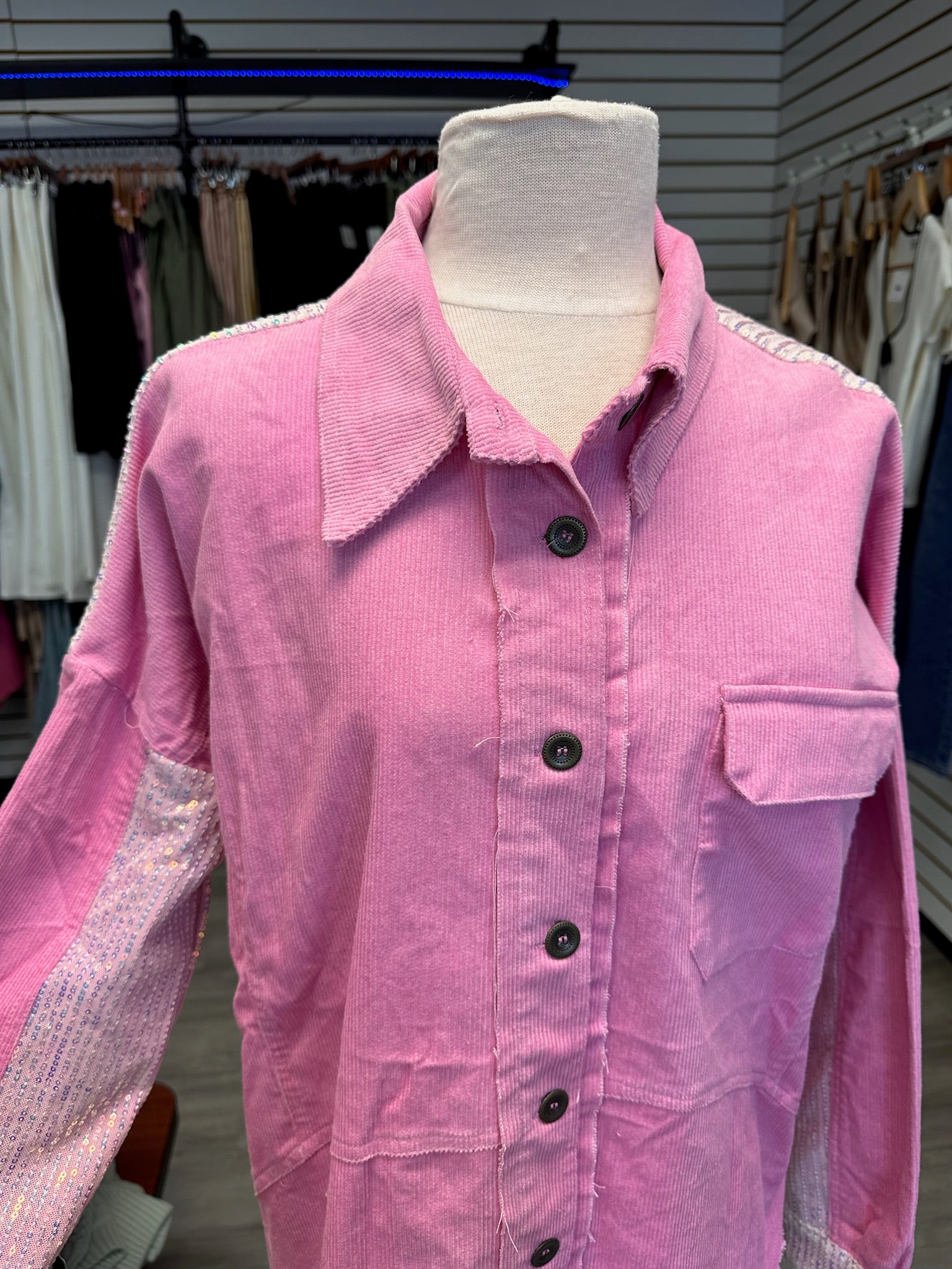 Shimmer and shine in our pink sequin corduroy shirt! This oversized statement piece is the perfect combination of playful and chic. The sequins add a touch of glamour while the corduroy fabric keeps it comfy and casual. A must-have for any fashionista's wardrobe.